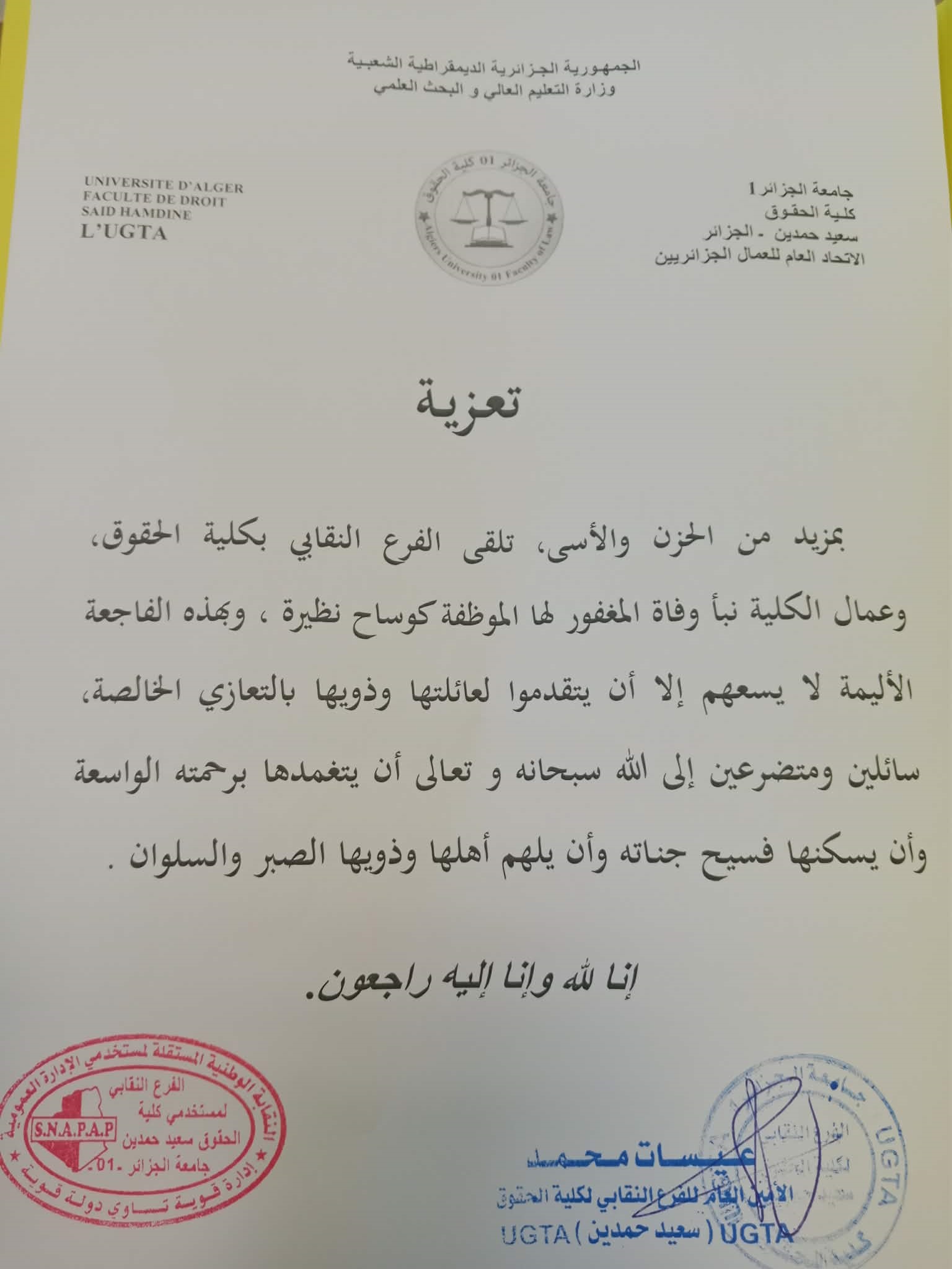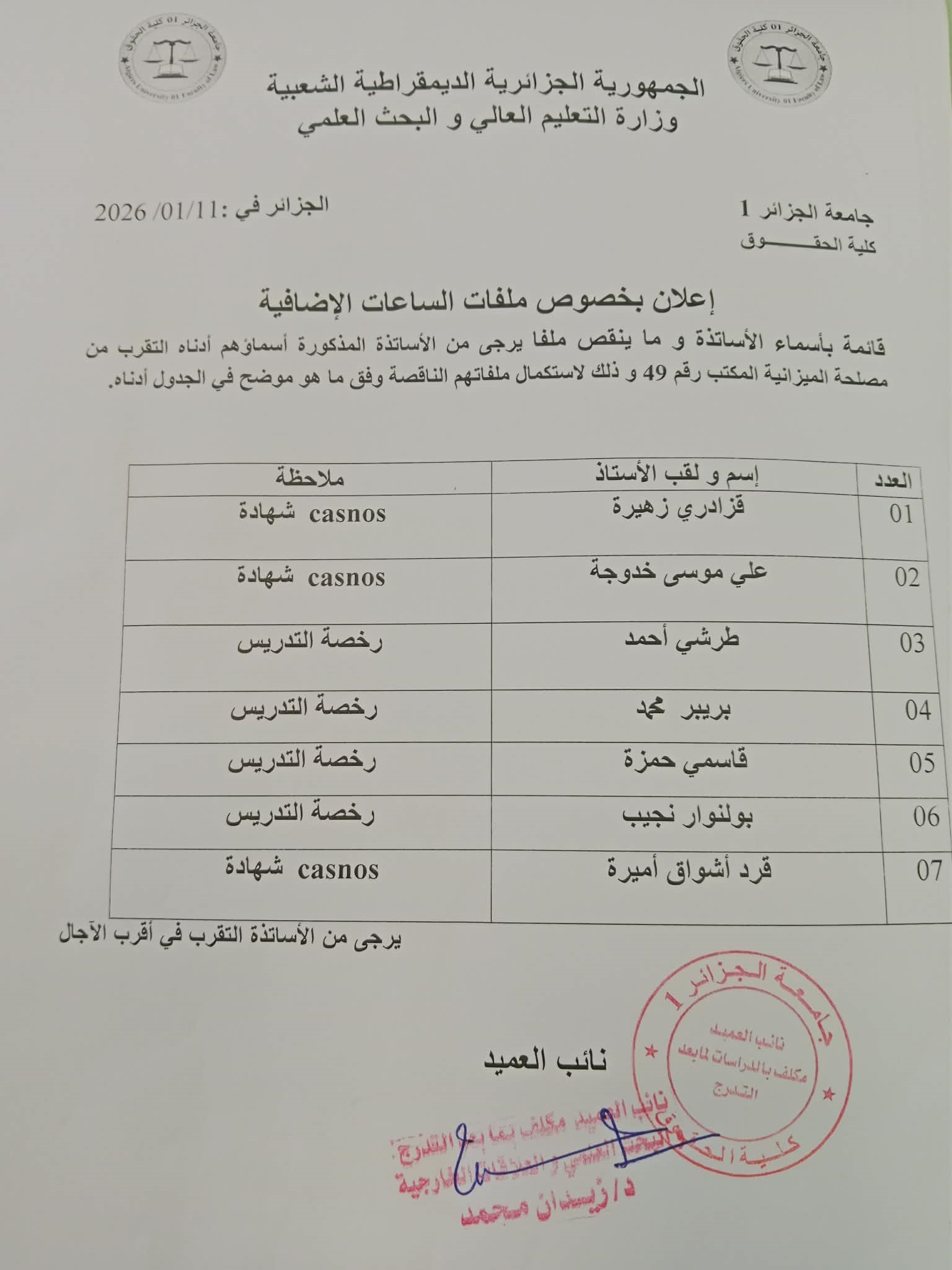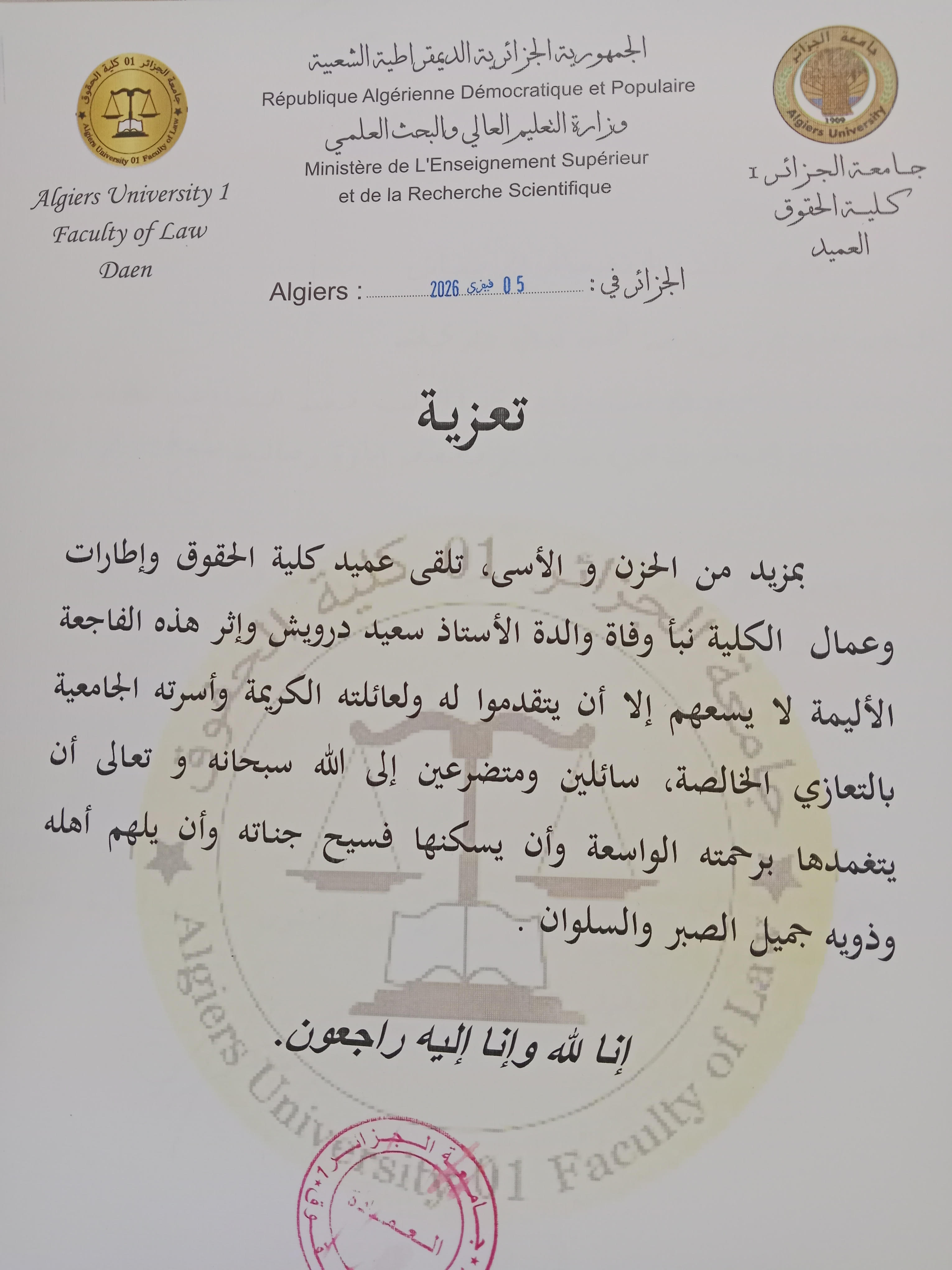منذ تعييني لإدارة هذا الصرح العلمي العريق الذي وجد بوجود تدريس مادة القانون في الجزائر سنة 1879، ورفقة زملائي في الطاقم الإداري ،الأساتذة والموظفين، كل من موقعه، نسعى جاهدين لجعل كلية الحقوق قطب امتياز للتدريس والبحث في مجال القانون.
