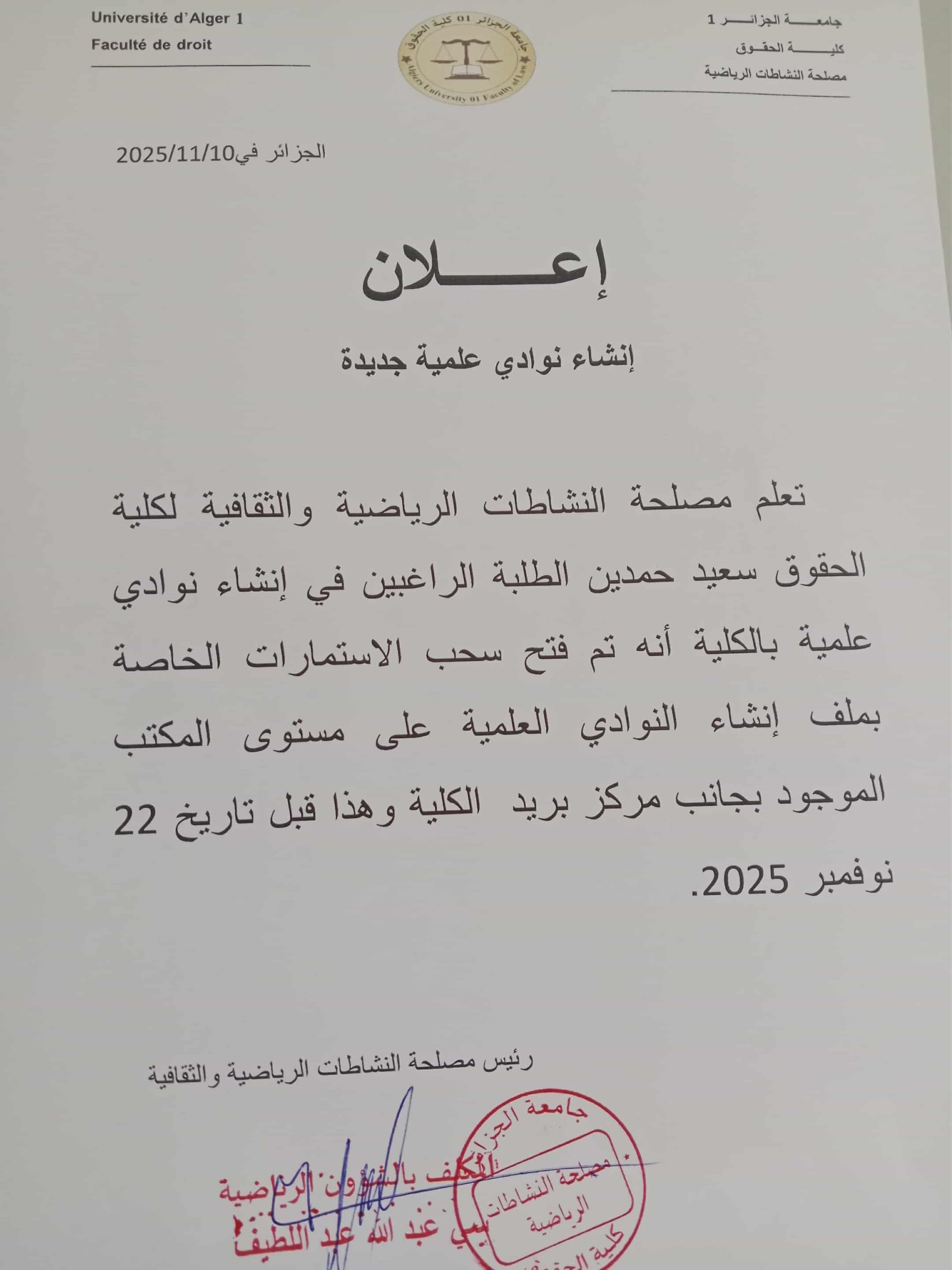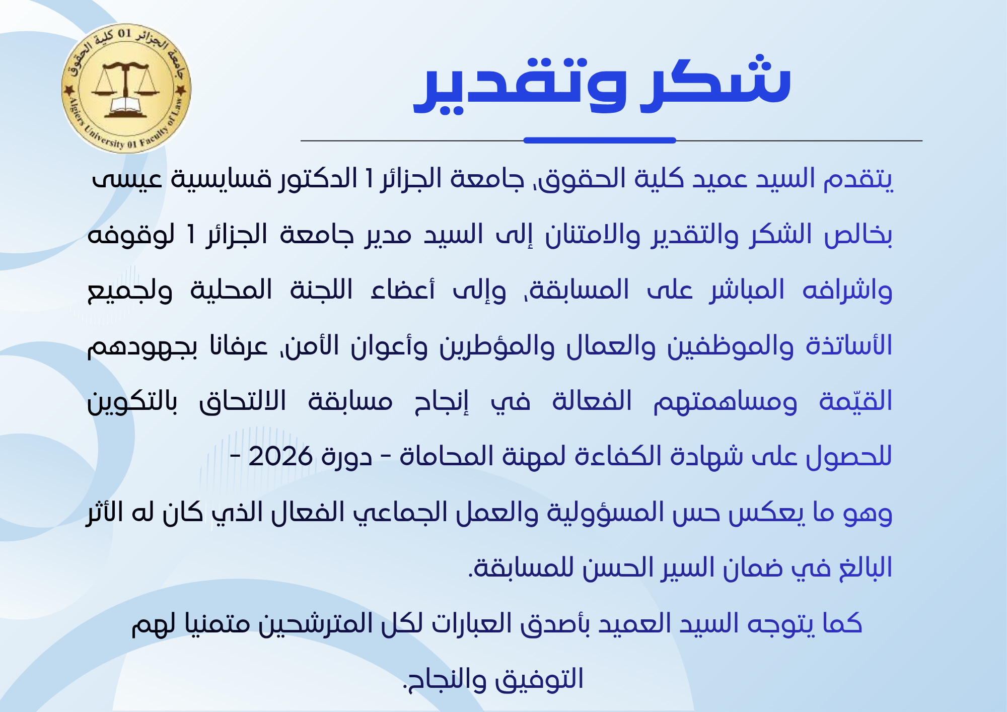 منذ تعييني لإدارة هذا الصرح العلمي العريق الذي وجد بوجود تدريس مادة القانون في الجزائر سنة 1879، ورفقة زملائي في الطاقم الإداري ،الأساتذة والموظفين، كل من موقعه، نسعى جاهدين لجعل كلية الحقوق قطب امتياز للتدريس والبحث في مجال القانون.